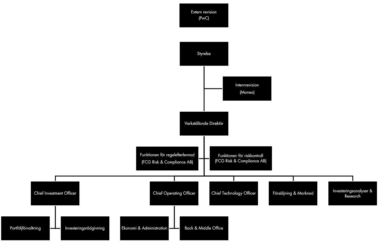 Bolaget har idag 4 heltidsanställda (varav 3 arbetar som förvaltare) samt ett antal deltidsanställda. För att säkerställa kvalitet och oberoende är funktionerna för Riskkontroll samt Regelefterlevnad outsourcade till Advisense AB. Moneo AB ansvarar för Internrevision och PricewaterhouseCoopers AB, huvudansvarig revisor Carl Fogelberg, ansvarar för Extern revision. Läs mer här om hur bolaget organiserar och styr verksamheten.